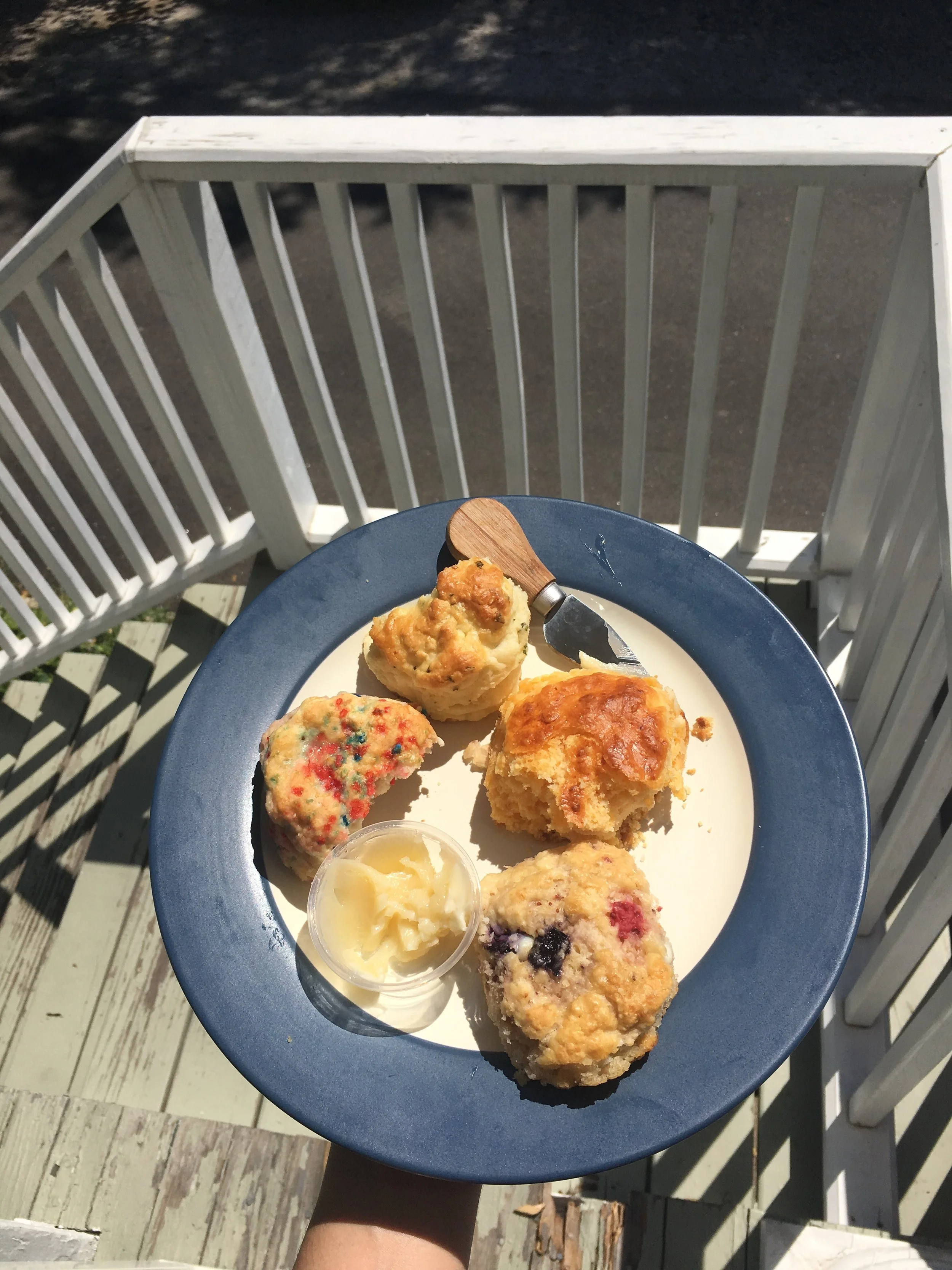 And Sunday I wake up to Suze and Al getting funky in the kitchen, making a perfect feast of radish/tomato salad, muffin top zucchini baked eggs, sliced avocado, summer fruit, and the most amazing biscuits I've ever tasted with zany flavors -- srircha, garlic/chive, and sprinkle. The biscuits are the brain trust of their good pal, and her company is called Brwn Co (go go if you live in Baltimore) which almost make you levitate they're so tasty.