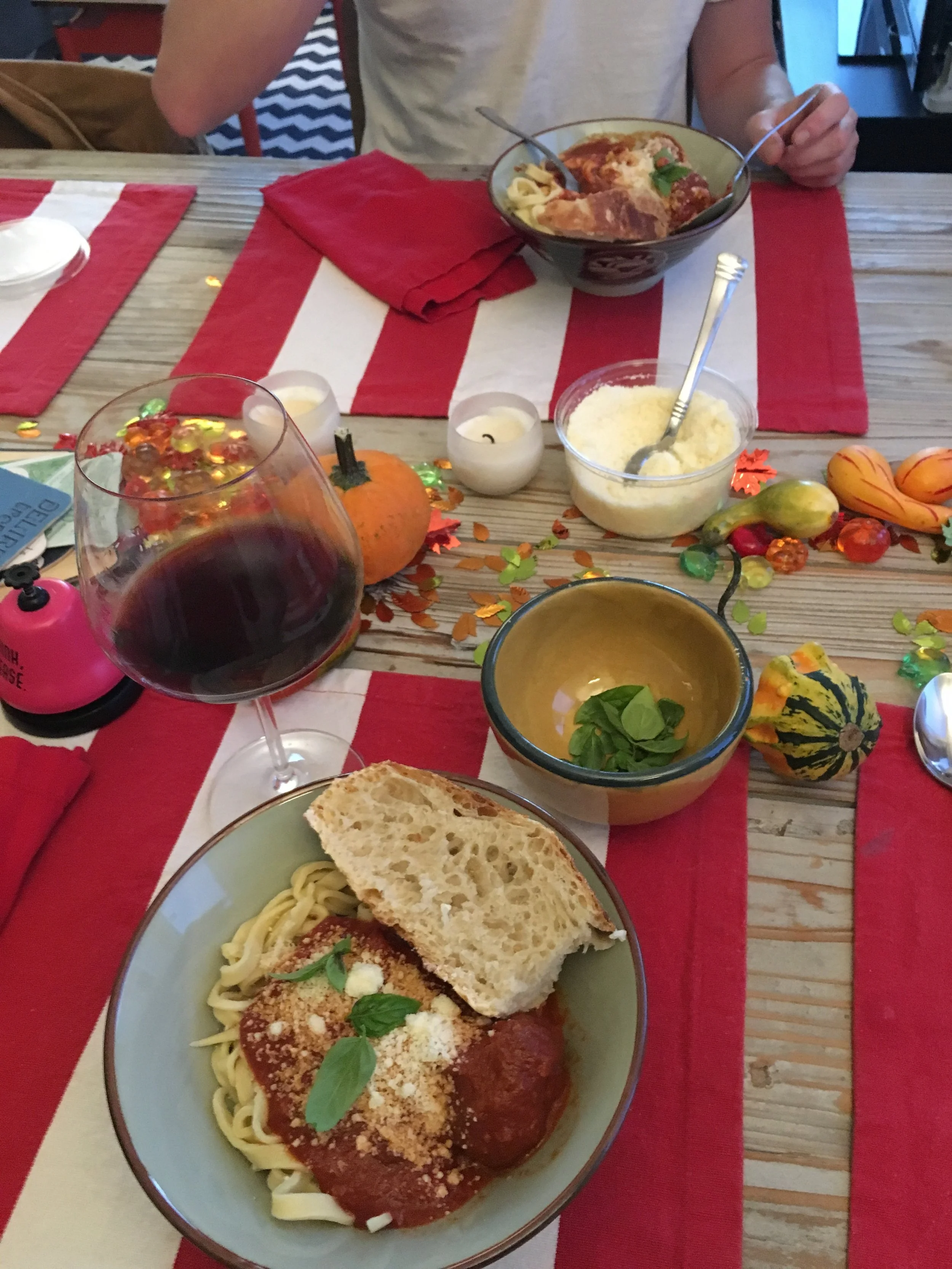 10 minutes later, we were listening to the Bee Gees and drinking Pinot Noir and feasting on homemade fettuccine, red sauce with meatballs and freshly risen bread. Seriously delish.